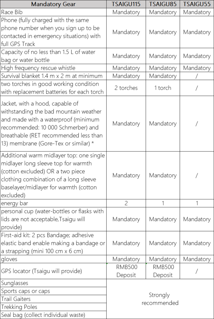 2020 Ultimate Tsaigu Trail Mandatory Gear List